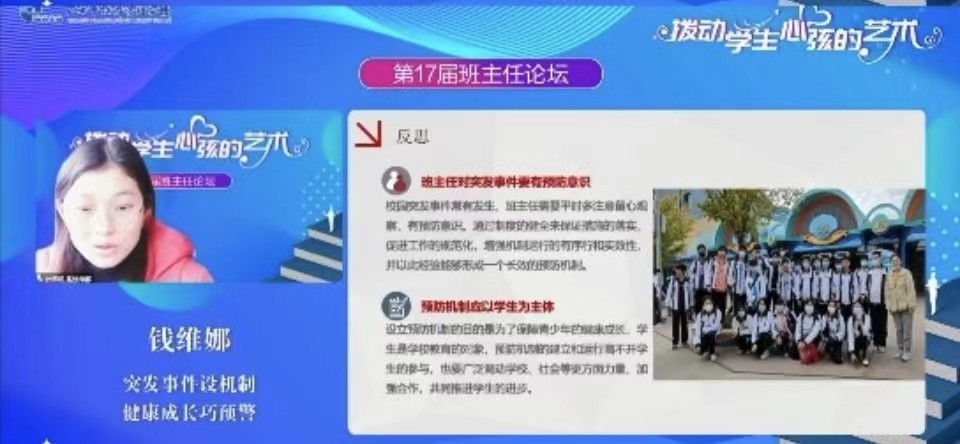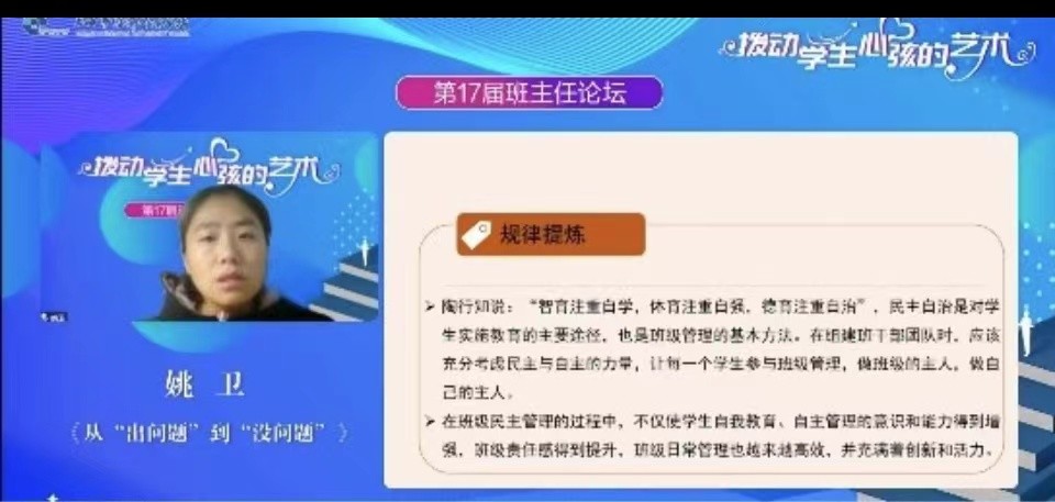 最后,石婕健主任对本次论坛进行了总结。她充分肯定四位班主任的专业素养和教育情怀, 感谢两位专家的精彩点评和指导。石主任指出,班主任作为班级的引领者、组织者和学习者,班主任队伍建设是学校的一项重要工作;此次论坛中四位班主任的宝贵心得和两位专家的建议对其他班主任具有非常重要的借鉴意义。她希望更多的班主任结合学生成长过程当中的新情况、新变化,分享更多引发思考的育人故事。同时,倡议大家多倾听,多学习,多思考,人人争做优秀班主任。