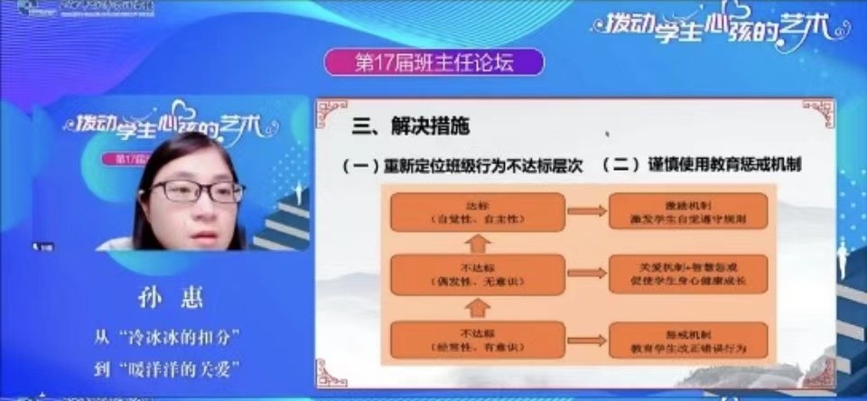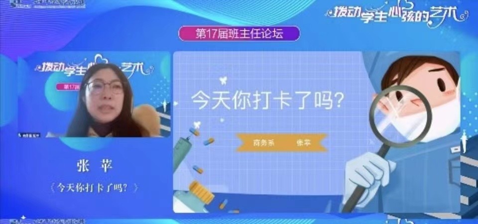 活动中,财经系姚卫老师、计算机系孙惠老师、商务系张苹老师和计算机系钱维娜老师先后进行展示交流。四位班主任老师分别抛出了四个问题:班干部的责任心不强如何管理?学生行为规范教育如何开展?疫情下学生体温打卡不及时怎么办?如何有效处理班级突发事件?他们分别从问题呈现、原因分析、实践做法、成效反思和规律提炼、总结五个方面做了分享和交流。四位班主任观点鲜明、思路清晰、善于总结归纳日常班级管理中的方法和策略并且加以提炼,从而形成了自己班级的管理心得,彰显了班主任们树德立人、爱岗敬业、刻苦钻研的人格魅力。参展班主任的精彩分享,赢得了专家和领导的高度好评。两位专家在肯定的同时,给出了很多精准的专业指导。全校61个班级的班主任全部观摩了本次班主任论坛,参与率达到100%。