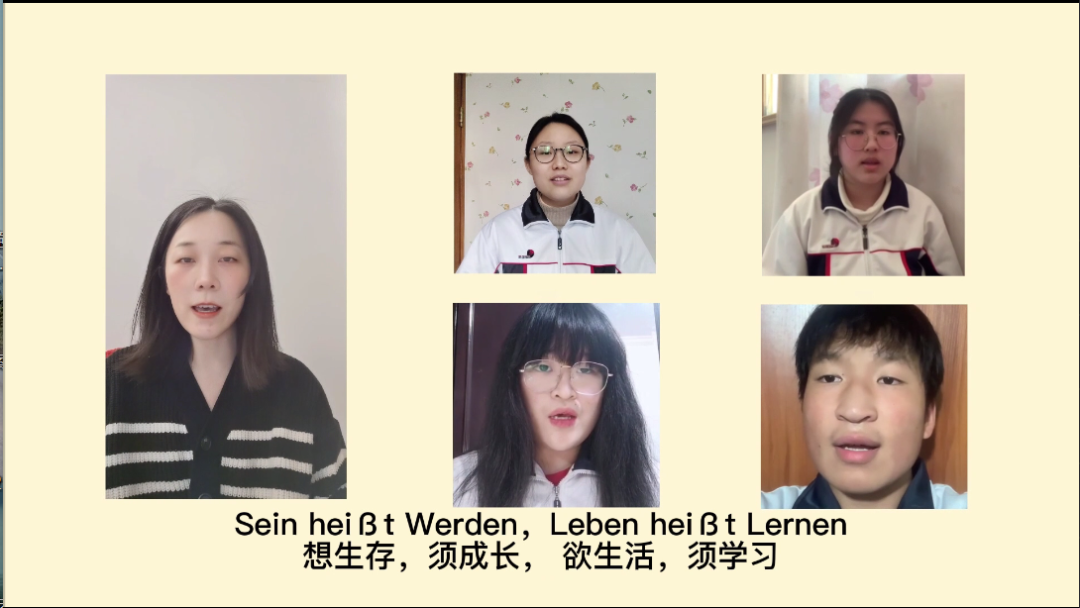 在本次比赛中,我校10位师生齐声合唱了德语歌曲《星之金币》。视频以歌曲的形式娓娓讲述了一位父亲对孩子的忠告:“你必须前进”,“想生存,须成长,欲生活,须学习”的同时,也道出了爱的真谛:爱便是给予孩子更多的信任和更广阔的世界。