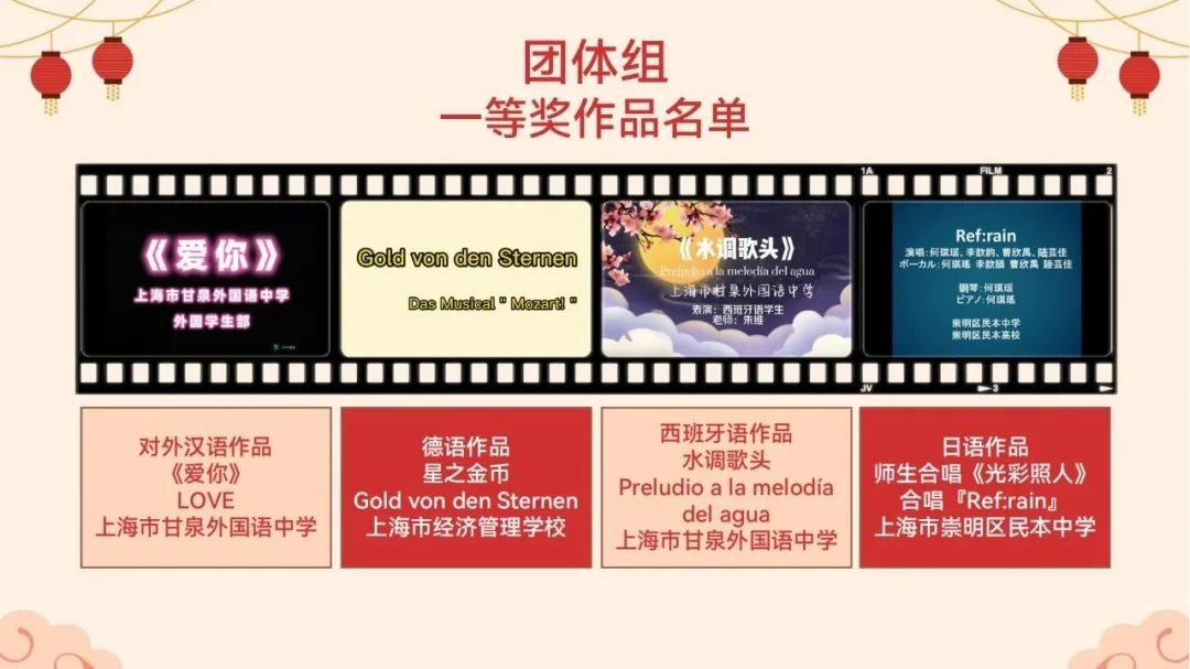 在本次活动中,上海市中小学多语种教师及学生们充分发挥多语种特色与特长,共同出镜完成了一件件极具匠心且精彩纷呈的视频作品。在各校师生的大力支持和积极参与下,共计收到日语、俄语、德语、法语、西班牙语、意大利语、阿拉伯语等10个语种的作品。其中个人作品19件,团体作品30件,总计参与人数260余人。1月13日展示活动当天,有900多名教师和学生观看了线上直播,并对展示作品给予了高度评价。评审组从语言表达、内容创意、艺术审美、整体效果等方面,对报名作品进行综合评审,最终评选出个人组和团体组一等奖各4名,以及二等奖、三等奖作品若干。
