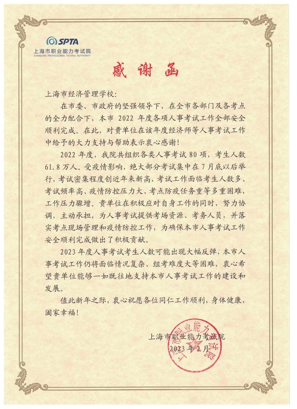 上海市职业能力考试院向我校发来感谢函