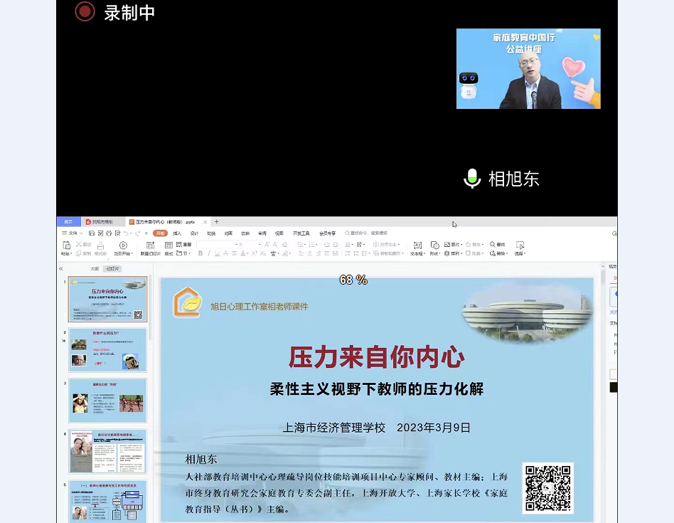 为帮助我校教师缓解职业压力,增强工作价值感和生活幸福感,3月9日,校人事处特邀上海市终身教育研究会家庭教育专委会副主任相旭东,开展了主题为“柔性主义视野下的压力化解”的线上心理讲座。我校中层干部、党支部书记、各教研室主任参加了培训。