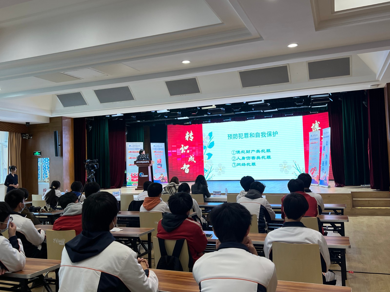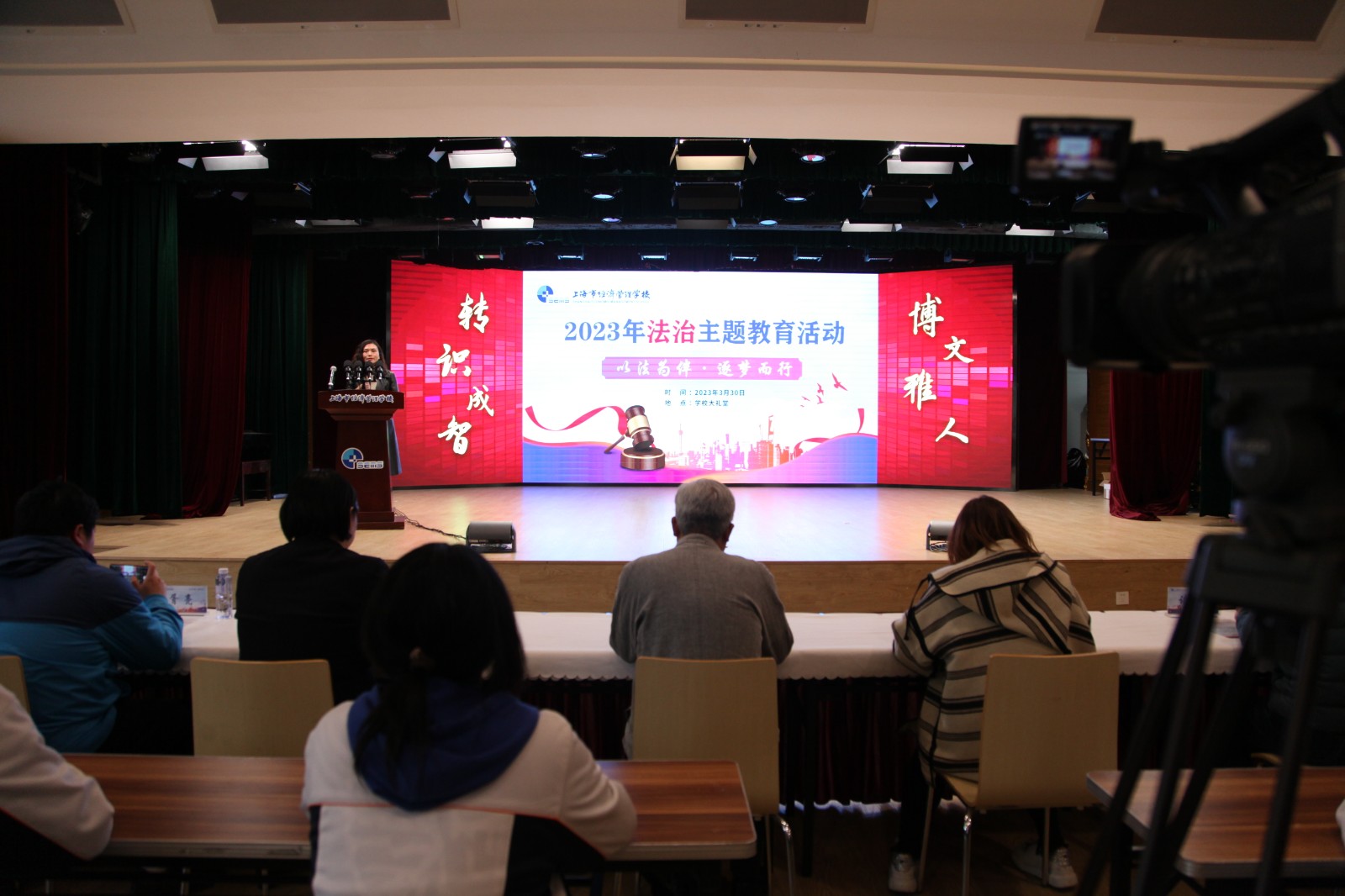 为了切实加强学校法治宣传教育工作,推进依法治校,营造良好的法治育人校园氛围,保护未成年人健康成长,3月30日下午,“以法为伴,逐梦而行”——法治主题教育活动在我校大礼堂举行。校党委副书记兼纪委书记沈林、上海市普陀区人民检察院第一检察部未成年人检察办案组检察官王蕾、阳光普陀工作站联校项目负责人薛春燕、阳光普陀工作站长寿工作点点长胥亮和我校各系德育主管出席,全校学生通过线上与线下相结合的形式参加活动。本次活动由学生工作处主任石婕健主持。