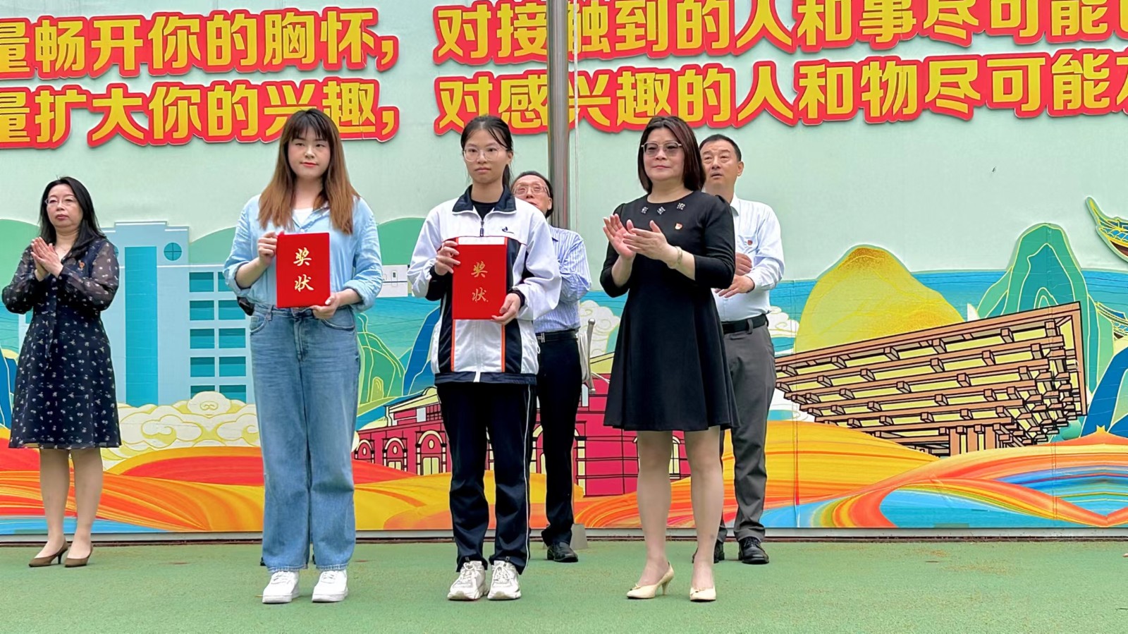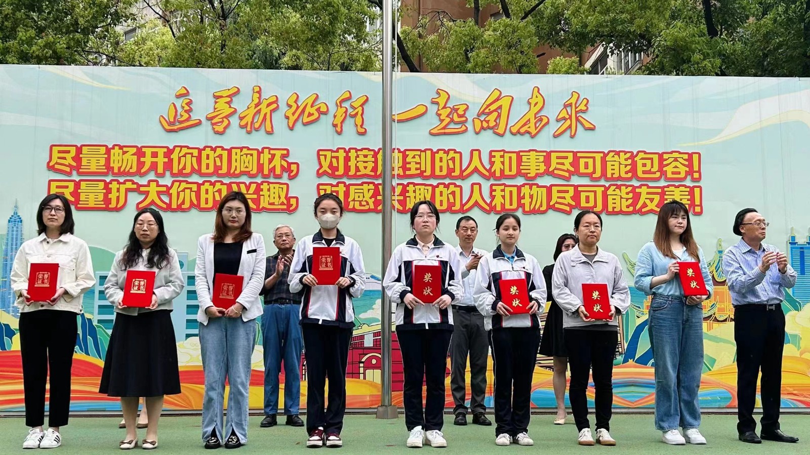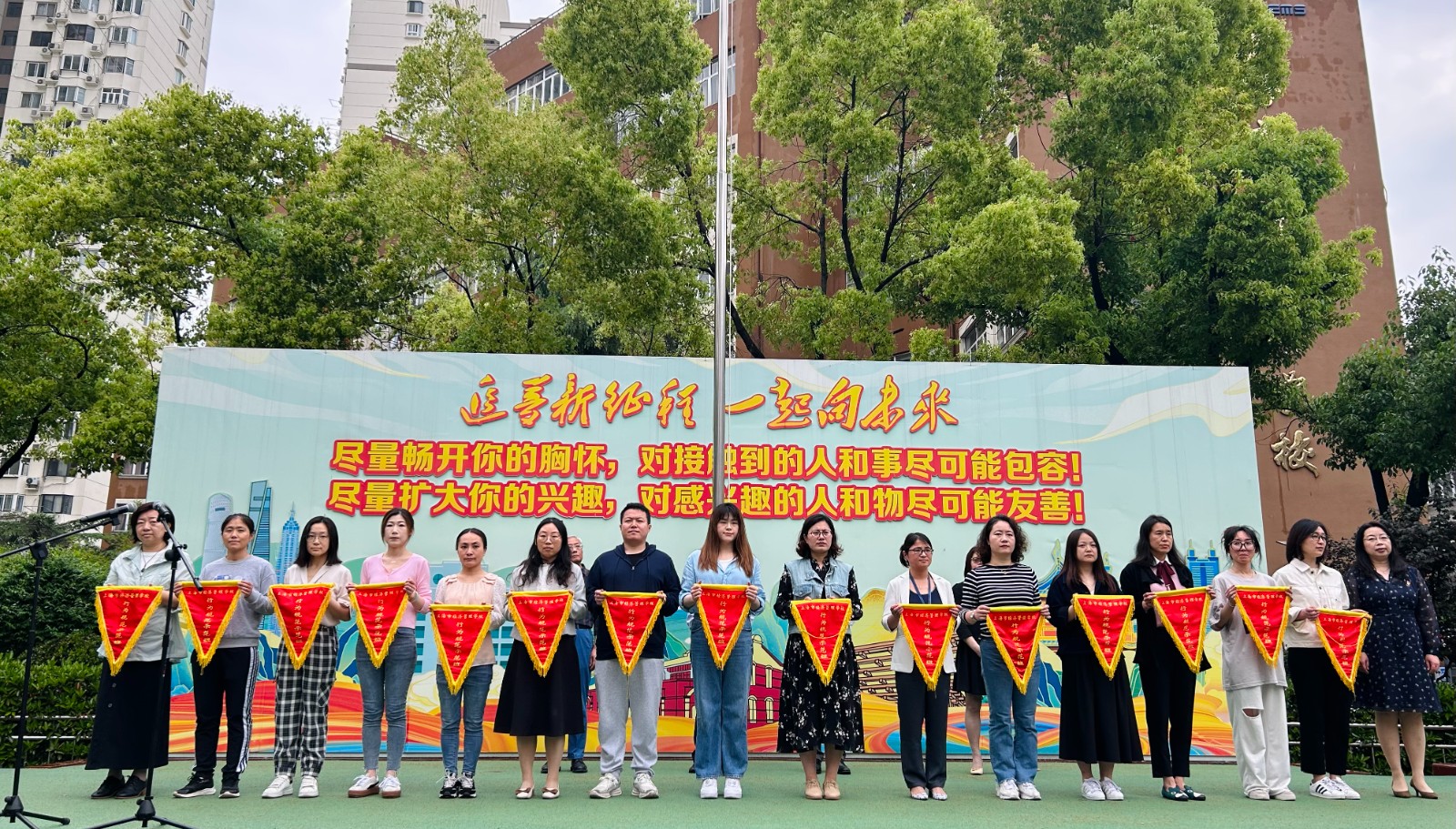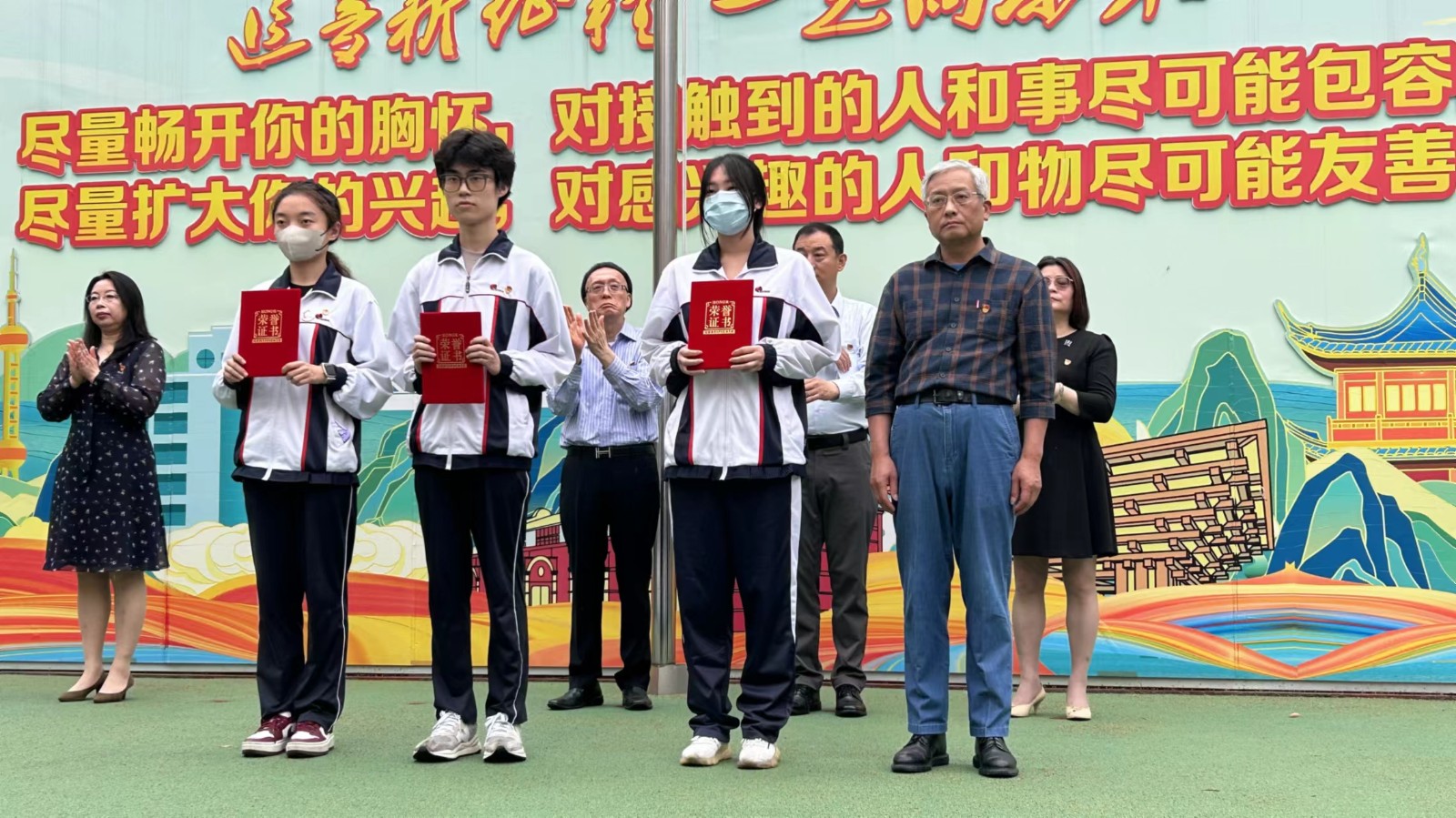首先举行升旗仪式。仪式上,校领导先后为获得学校四月份“行为规范示范班”的班级、在“未来杯”上海市高中阶段学生未来演说家大赛中获奖的学生、在上海学校共青团“喜迎二十大、永远跟党走、奋进新征程”主题微团课大赛中获奖的师生、在上海市中等职业学校“技能成才 强国有我”主题教育活动和2022上海市文明风采评选活动中获奖的师生进行了颁奖。