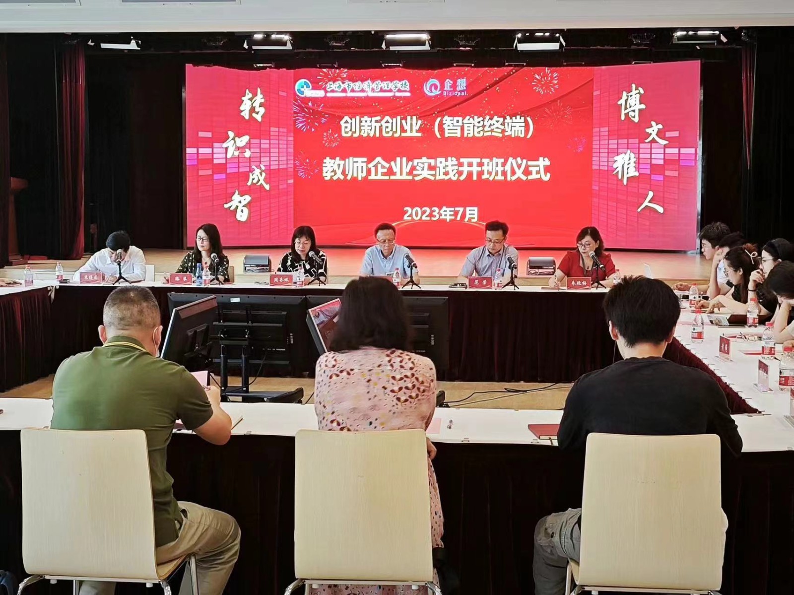 为贯彻落实教育部及上海市教育委员会《上海市职业院校专业教师企业实践培训标准》文件精神,加强职业院校“双师型”教师队伍建设,7月6日,创新创业教育(智能终端)教师企业岗位实践项目开班仪式暨需求诊断会在上海市经济管理学校大礼堂举行。上海市教育委员会教育技术装备中心党总支书记、副主任周齐佩,我校校长沈汉达教授、上海市第二轻工业学校校长滕琴、上海市商业会计学校副校长范荣、中华职业学校教师培训中心主任徐耘、上海市现代流通学校物流教研部主任彭宏春、上海信息技术学校信息技术系副主任林丹丹、上海市工业技术学校后勤保障部副主任王岭和来自企业的代表上海企想信息技术有限公司束遵国总经理、上海企想信息技术有限公司资深顾问杨益豪、赵士玲、钟亦周等出席,本届教师企业岗位实践培训班全体学员参加。开班仪式由我校计算机系主任朱艳梅主持。
