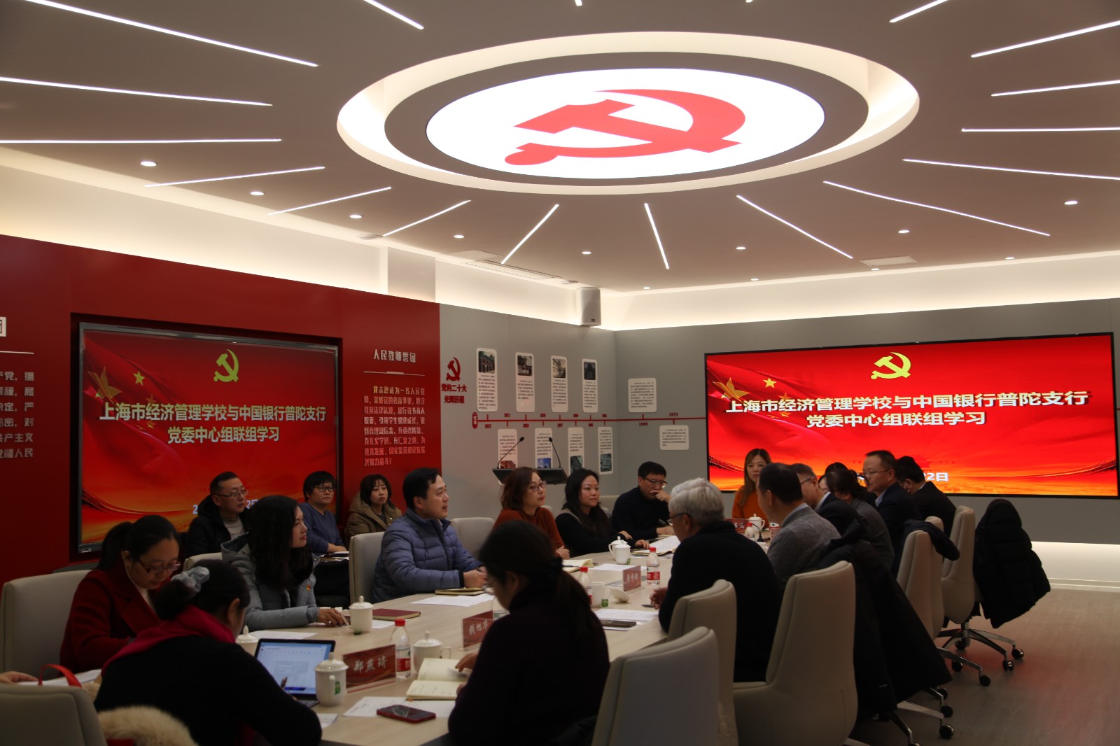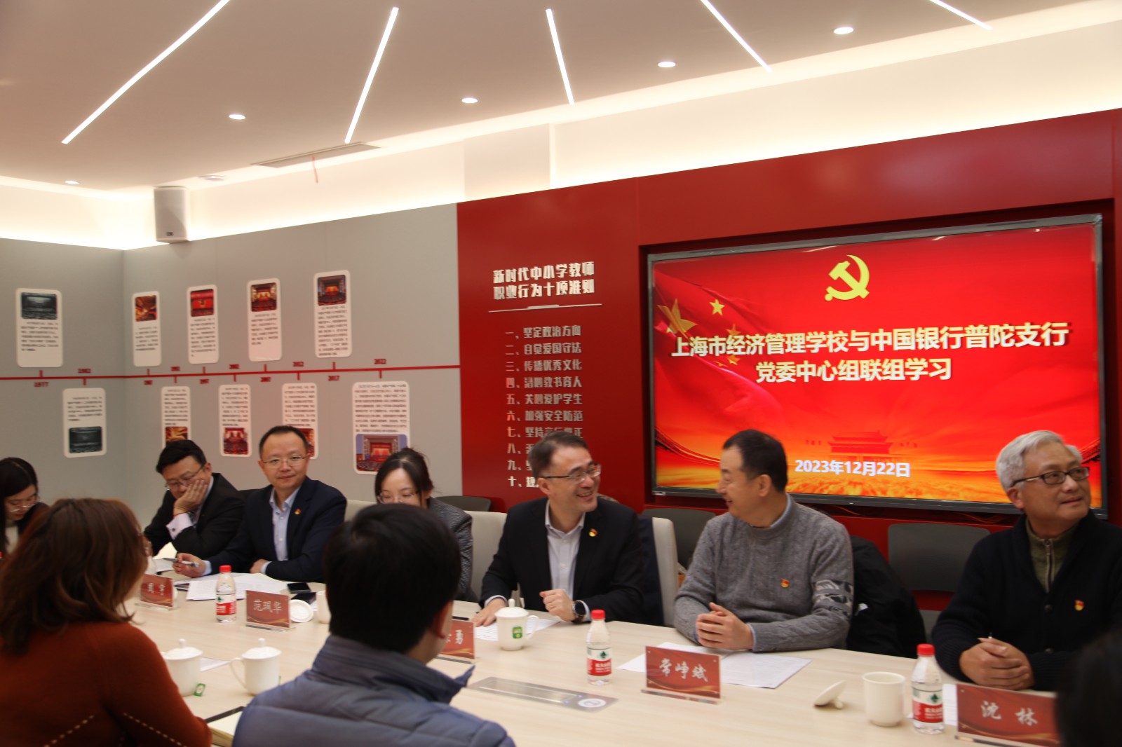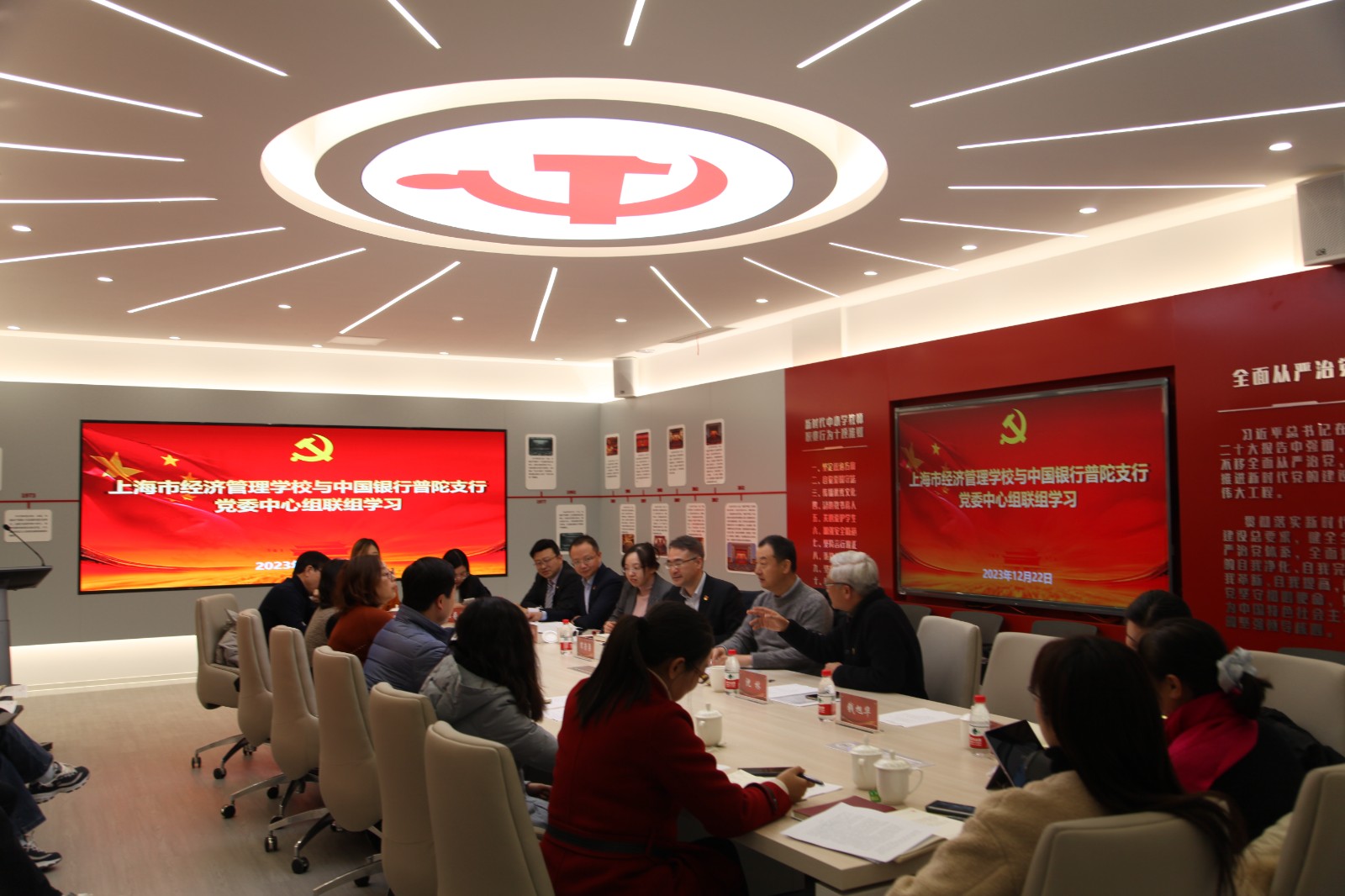 12月22日,上海市经济管理学校党委与中国银行普陀支行党委中心组联组学习在党建活动中心开展,共同学习贯彻习近平总书记考察上海重要讲话精神和深入推进长三角一体化发展座谈会精神。本次联组学习由校党委副书记、纪委书记沈林主持。