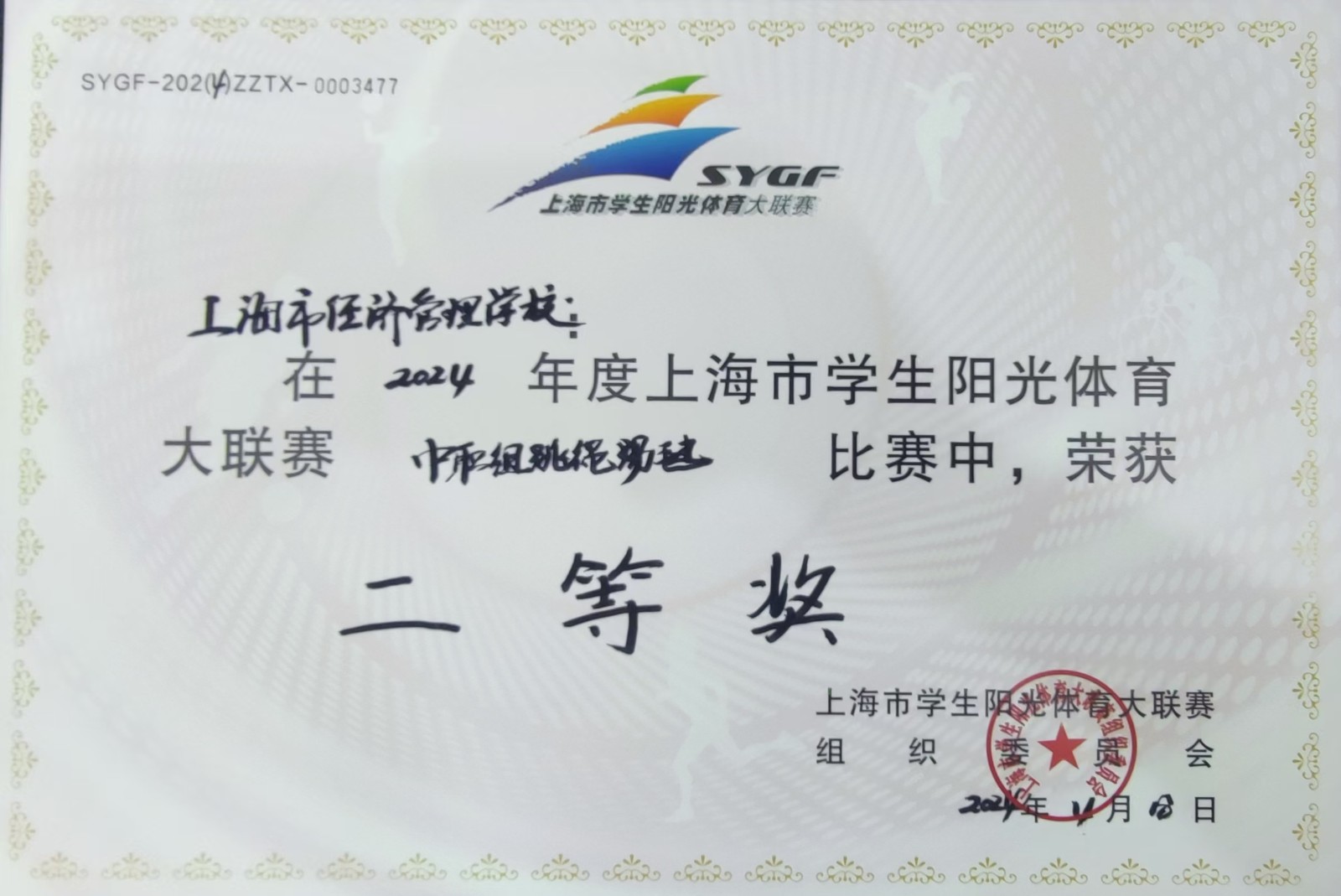 近日,学校在2024年度上海市学生阳光体育大联赛中职组跳绳踢毽比赛中,荣获二等奖。