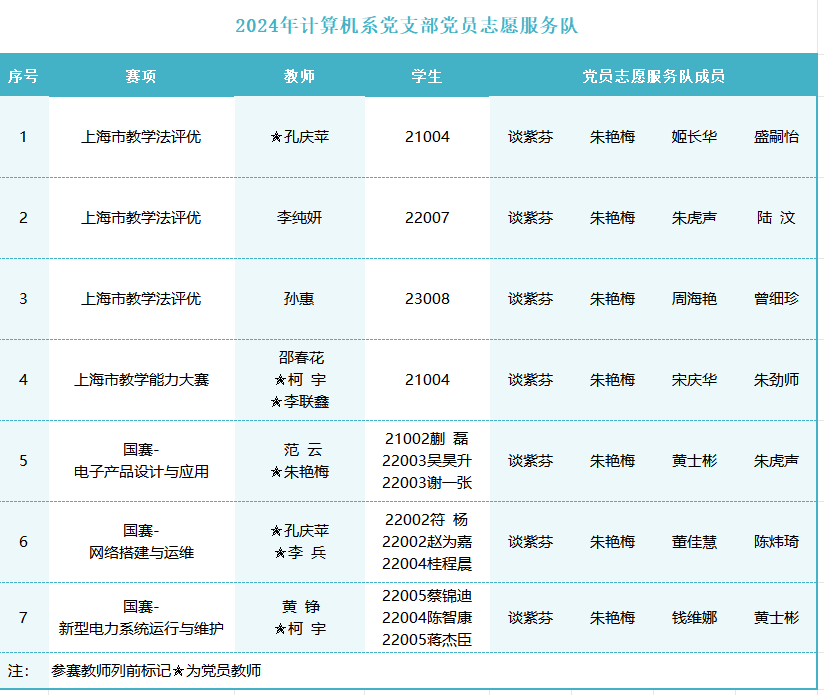 本学期,计算机系多位教师参加上海市教学法评优大赛、上海市教学能力大赛,还有一批优秀的学子代表学校参加国赛。为了确保这些活动的顺利进行,计算机系党支部积极响应,迅速行动,成立了志愿者服务队,发挥党员的先锋模范作用,为老师和学生提供全方位的帮助和支持。