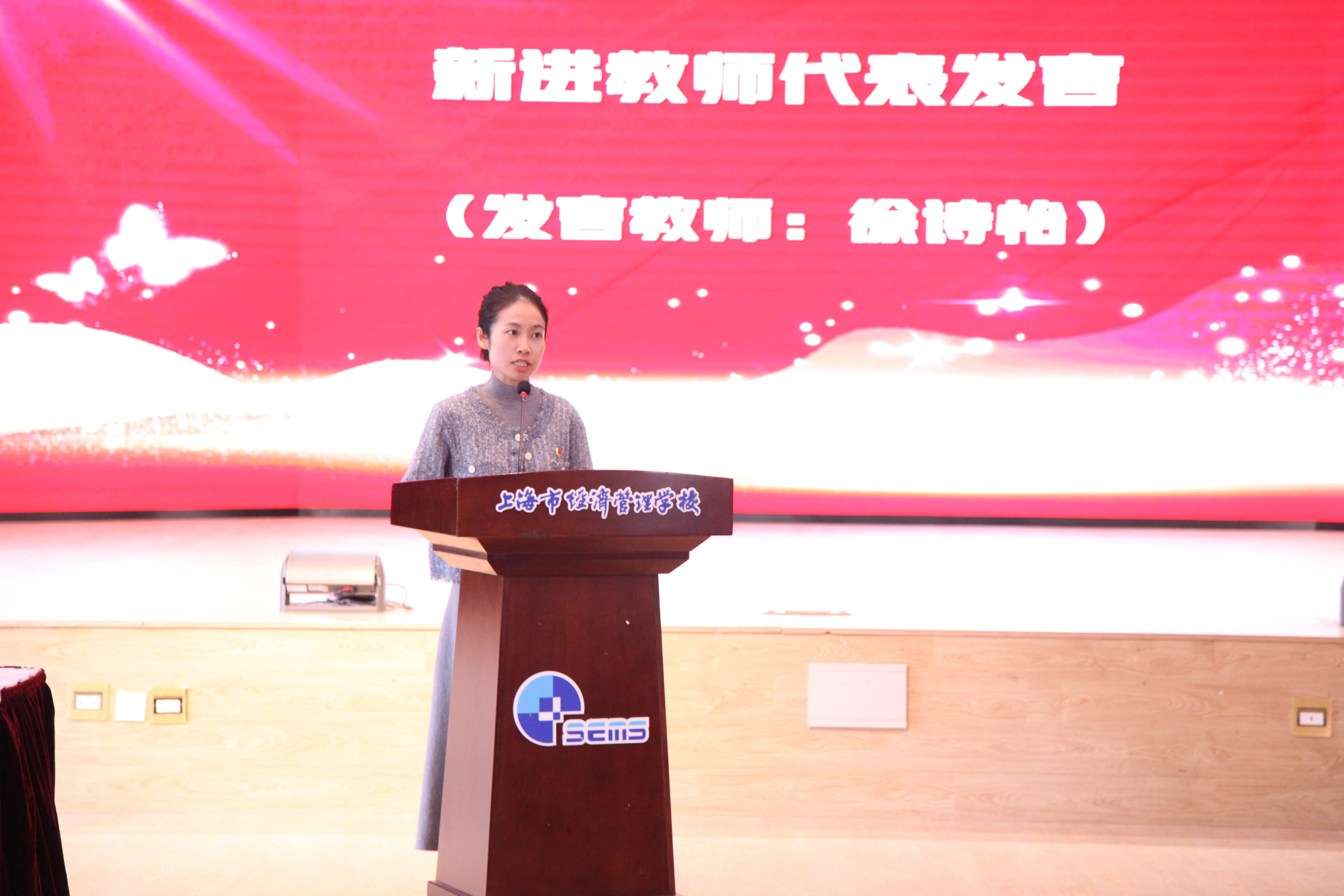 作为新进教师代表,徐诗怡老师上台发言。她提到学校“传帮带”平台为新教师成长提供支撑,前辈教师的专业素养与教育情怀值得学习,并表示未来将主动向带教老师学习,以项目驱动教学激发学生创作热情,融合经济管理思维拓宽教学视野,助力学生在艺术设计学习中兼顾美学与实用。