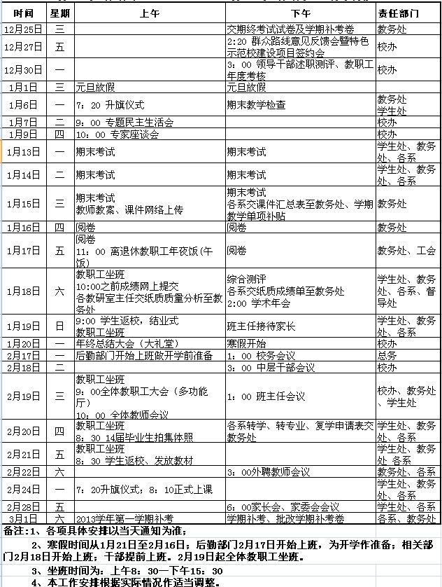 2013学年第一学期期末2013学年第二学期期初工作安排表